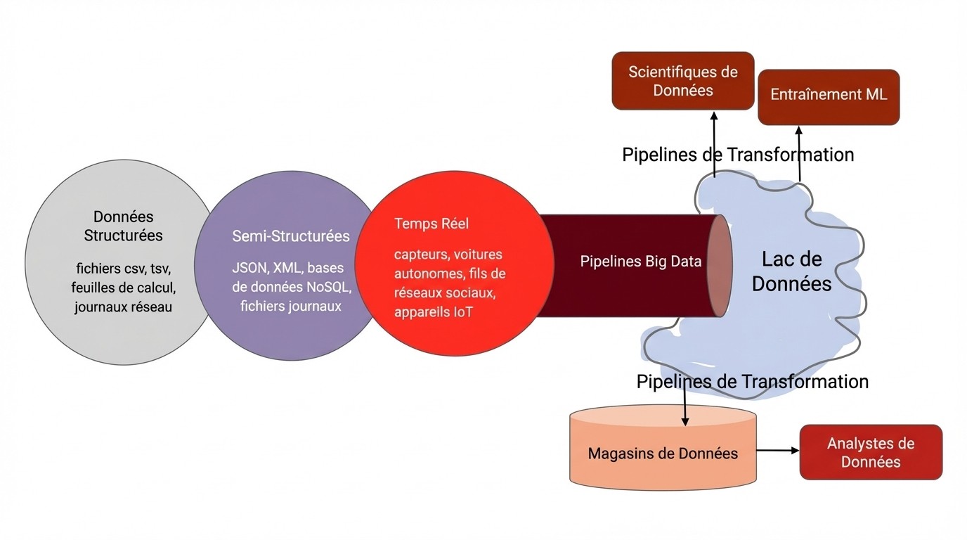 Ce sont les matières premières - d'où proviennent vos données. Celles-ci peuvent inclure des bases de données clients, des journaux de transactions, des APIs externes, des données de capteurs IoT et des flux de données tiers.