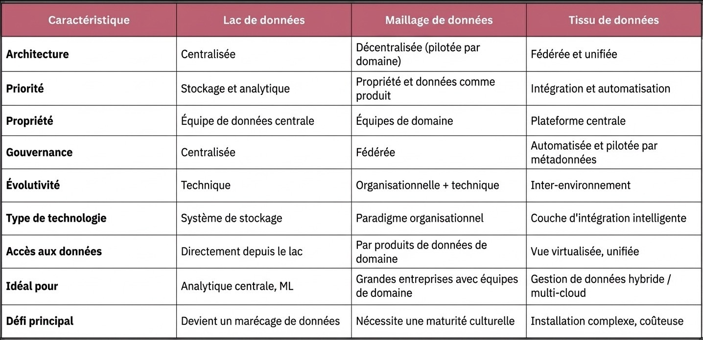 Nous garderons une plongée en profondeur dans le Data Fabric pour une autre fois, mais je veux m'assurer que vous obtenez une valeur immédiate de ce guide. Ci-dessous se trouve une comparaison des architectures de données clés pour vous aider à déterminer quand chaque approche est la plus efficace.