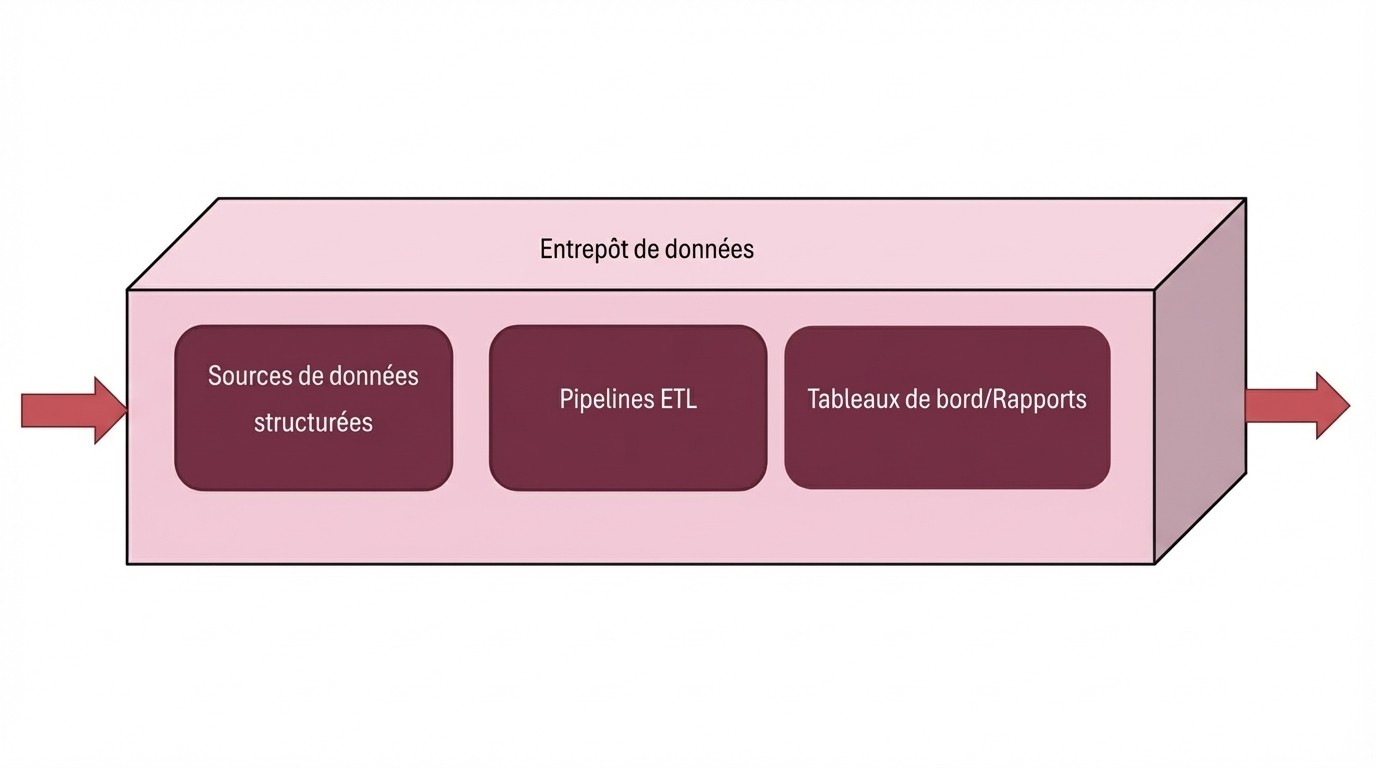 Sources de données → Pipeline ETL → Entrepôt de données → Tableaux de bord/Rapports